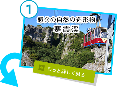 ロープウェイで渓谷美と瀬戸内海を一望できる、観光名所です。映画「僕とママの黄色い自転車」「八日目の蝉」のロケ地にもなりました。風雨の浸食によってつくられた奇岩、垂直にそそり立つ大岩壁の中をいくロープウェイからの眺めはまさに絶景。