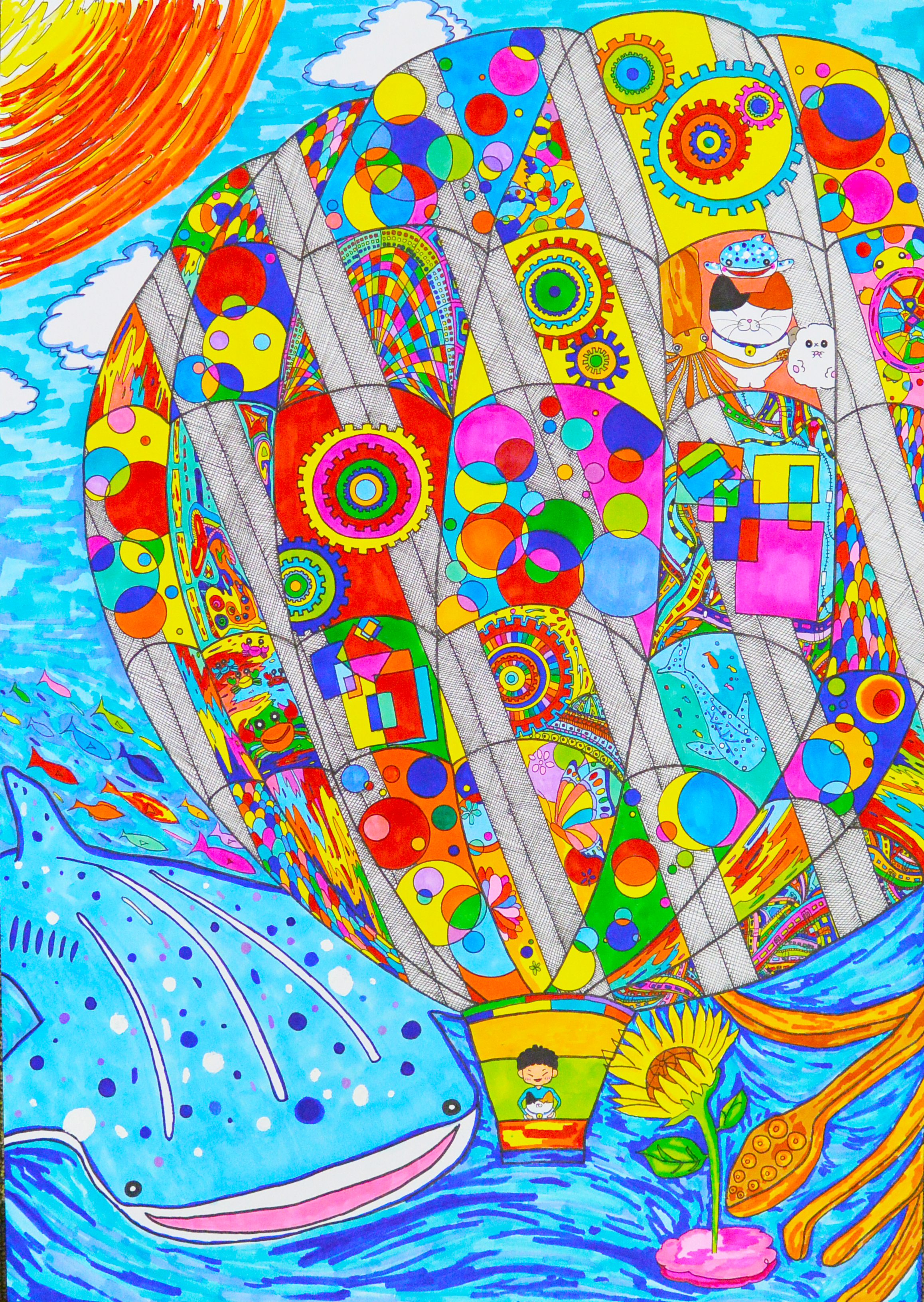 審査員作品評小学生ならではの非常に抽象的な構成が印象的。色や技法が豊富。色を多く使っているが破綻なく上手くまとまっている。ハートを描くのも大変だと思うがうまく描けている。